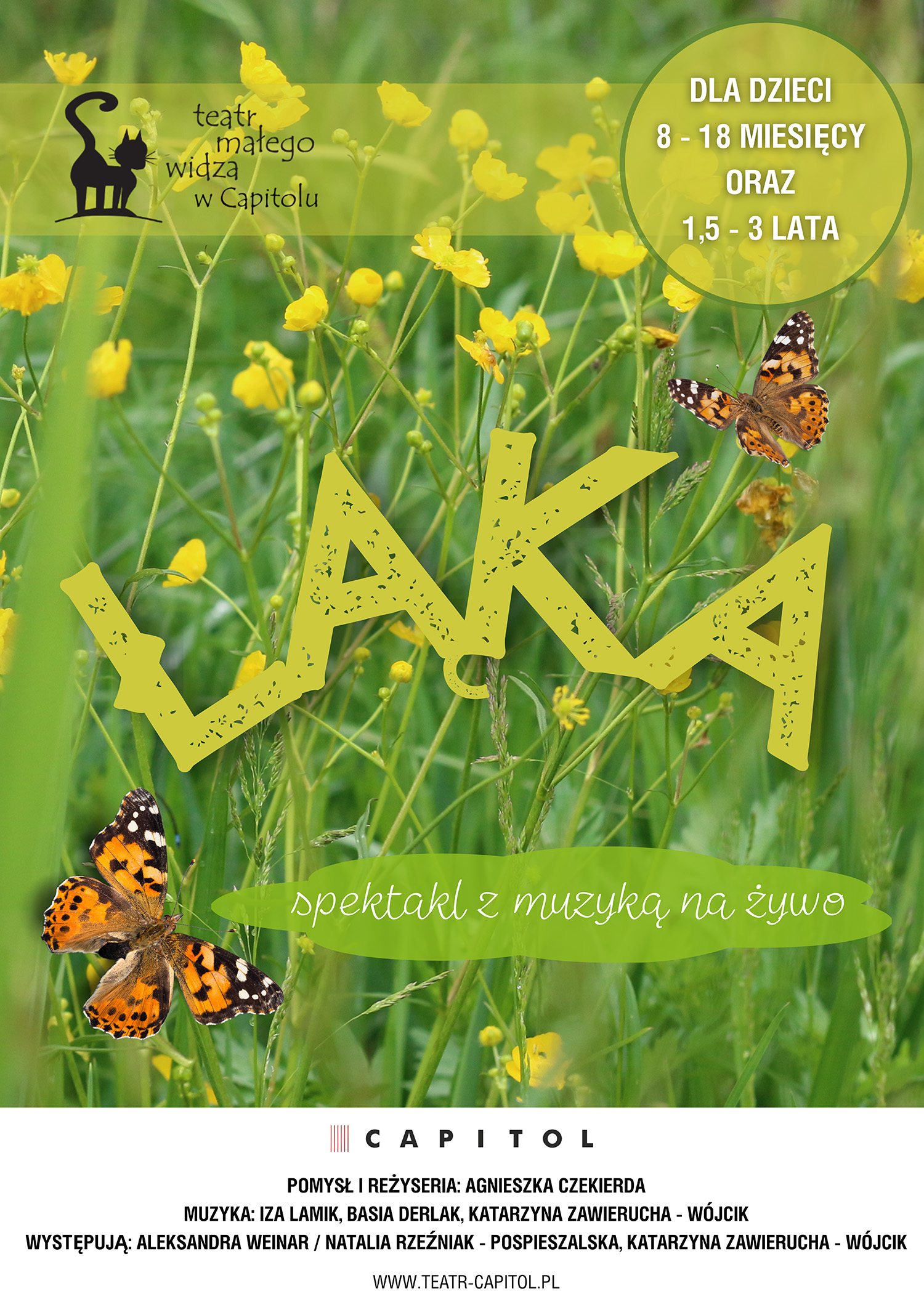 “Łąka” w reżyserii Agnieszki Czekierdy to spektakl–koncert Teatru Małego Widza w Capitolu, w którym dzieci mogą swobodnie eksplorować zmysłami bezpieczną i przytulną przestrzeń. Towarzyszy im muzyka grana na żywo i nieskrępowana zabawa. “Łąka” to spektakl uczestniczący. Najmłodsi widzowie podczas wspólnego działania będą odkrywać ukryte w przestrzeni niespodzianki.
