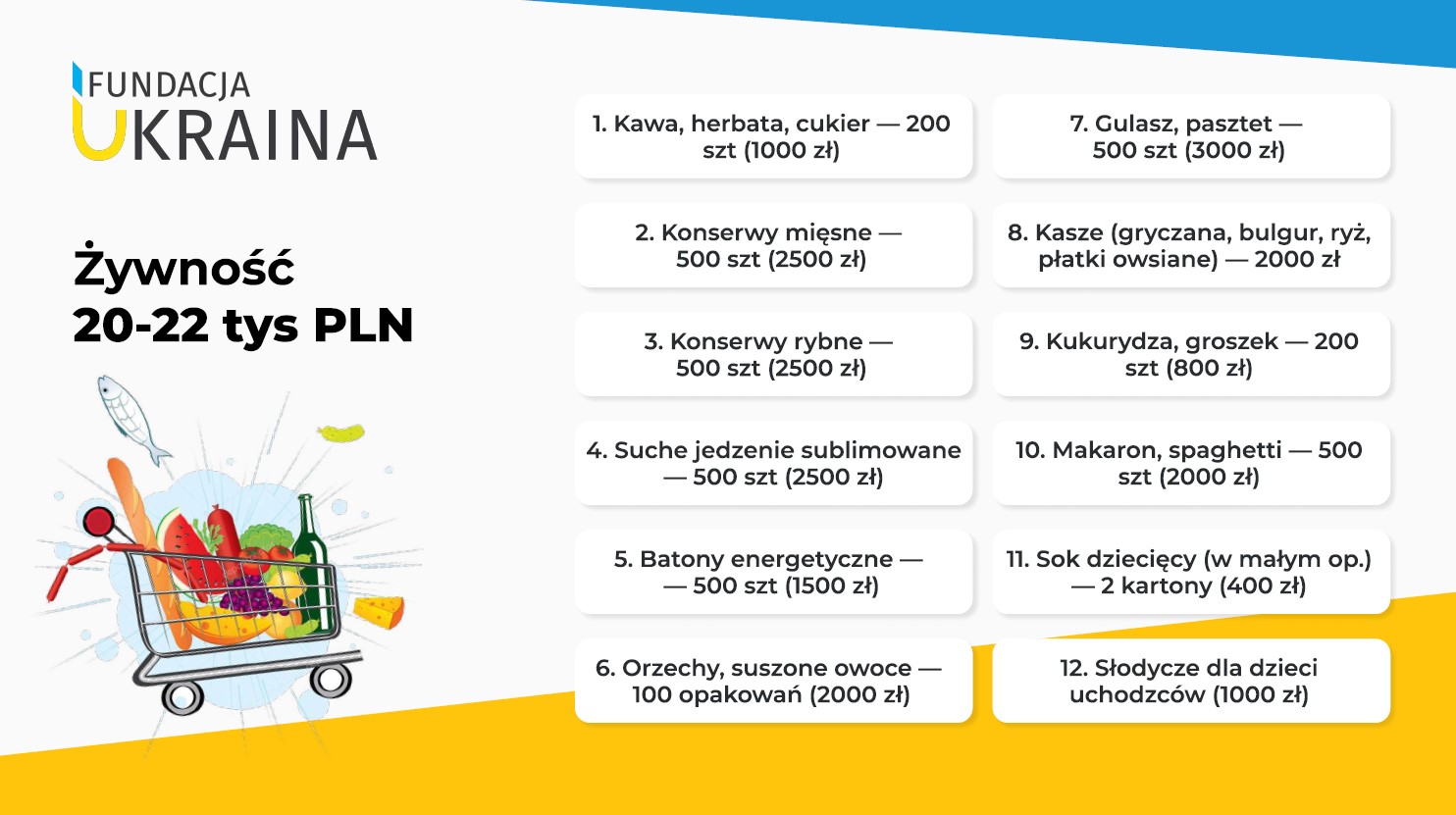 Żywność dla dzieci i dorosłych w domach tymczasowych to koszt 20-22 tys. zł tygodniowo. Twoją cegiełkę dołożysz do zakupu kaszy, makaronu, konserw, batonów energetycznych, a także kawy, herbaty i cukru, i drobnych słodyczy dla dzieci.
