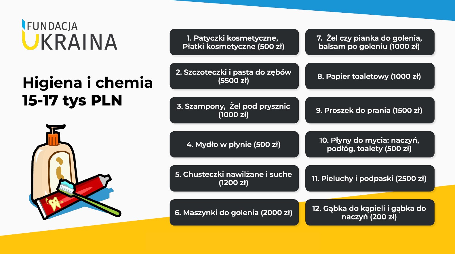 Środki higieny dla dzieci i dorosłych w domach tymczasowych kosztują około 15-17 tys. zł tygodniowo. Dołożysz m.in. do zakupu szczoteczek i pasty do zębów, pianki do golenia, papieru toaletowego i proszku do prania.