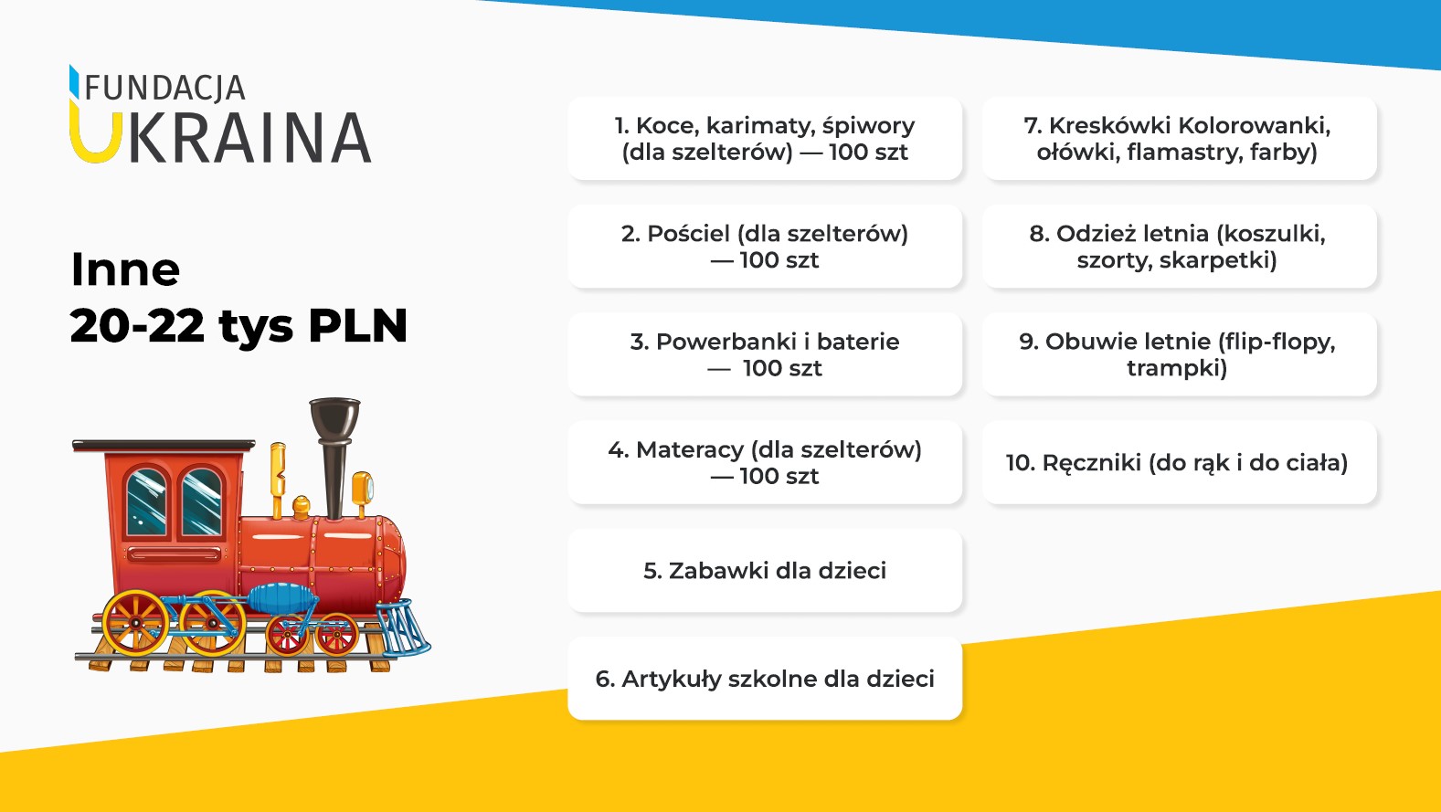 Dom – to także bezpieczne i ciepłe łóżko, ważne rozmowy przez telefon, zabawa i nauka. Dzięki Twojej pomocy będzie można kupić m.in. pościel, karimaty i materace, powerbanki, ale także kolorowanki i kredki dla dzieci, przybory szkolne i zabawki.
